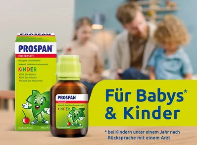 Weiterhin ist der Prospan® Hustensaft sehr gut verträglich und kann auch bereits von Säuglingen (bei Säuglingen unter einem Jahr Rücksprache mit dem Arzt halten) eingenommen werden.